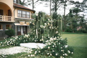 *Botanical Accents: Focusing on plants with healing properties and cool green hues. Instead of overly elaborate imported flowers, this trend utilizes local flowers and foliage, especially leaves and dried branches with unique textures (moss, fern, green pine needles), along with signature Dalat flowers like Hydrangeas, Salvias, or creamy white blooms, bringing a profound sense of intimacy and deep healing from Mother Earth.